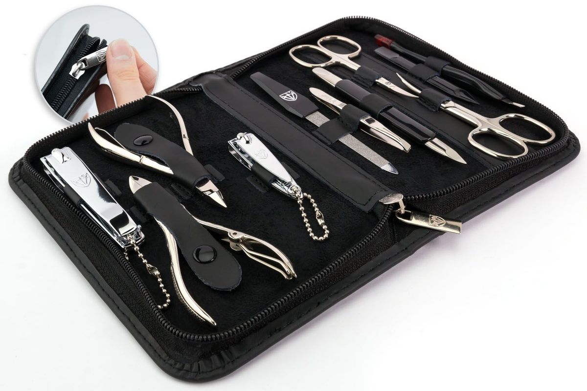 Kellermann 3 Swords Manicure & Pedicure Set with 11 Exttra-Fine Nail Tools in a Genuine Leather Black Case.