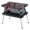Sturdy mobile tool box made from impact resistant plastic with a large lower storage area for power tools etc. The tool box has an integral Tow handle which slides out for ease of transport and stows away when not in use. Two internal nested tote trays to help separate smaller tools and aid easy access to most commonly used items. The lockable lid has two inset lidded storage compartments for small parts and or fixings.