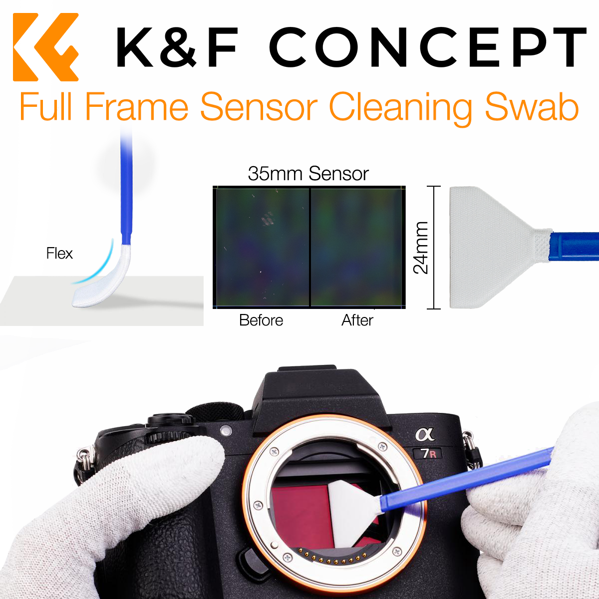 The soft front end of the swab makes light work of sensor dust and smudges. The front end of each swab is completely wrapped in microfine fabric cloth. The fibres are micrometre fine, creating a large surface area in which to absorb dust, smudges and fingerprints and other dirt. This ensures delicate cleaning for sensitive camera sensors, and less stress when cleaning time inevitably comes around. K&F use high-grade imported optical microfibre, which is extremely soft to the touch yet very densely woven. Microfiber fabric is the optimum material for cleaning your delicate sensor. It does not lint and leave behind particles on your sensor. A cheap swab that releases lint when cleaning would defeat the purpose of cleaning. The super soft fabric is safe to use on your sensor and will not scratch or damage your sensor surface when used correctly. At 24mm, the front end of the swab is perfectly tailored to cover the height of your 35mm full frame sensor, for a perfect pass of the swab. This means that you can clean the entire surface of your sensor with one wipe â no dust gets left behind, including the corners.