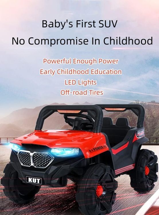 Battery Jeep gives your kids realistic driving experience just like a real Jeep with a horn, led Headlights, inbuilt music, USB, Aux & remote controller, You can connect it to USB port or Aux and play a wider selection of songs and stories. The buttons near the USB port are music modes, horn, Bluetooth button & volume Control.