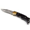 A true custom handmade Damascus steel lockback folding knife, Buffalo Horn handle, brass bolster, high quality solid blade, 256 layers of Damascus steel, genuine leather sheath.