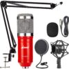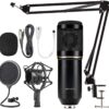 Included in the box is the condenser microphone, cable (XLR to mini-jack to connect directly to a PC), Metal Shock Mount, Microphone Sponge, Pop Filter, adjustable metal scissor arm mic stand (boom arm)