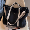 Stay stylish and organized on the go with this large tote bag featuring an adjustable strap and top handle in classic black and beige color combination.