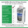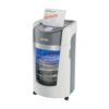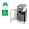 The Leitz IQ OptiMax office shredder provides an innovative and stylish shredding solution, whilst ensuring exceptional document security and peace of mind. This high-security DIN P5 paper shredder effortlessly shreds up to 10x A4 sheets at a time into micro-cut pieces. IQ OptiMax features unique Bin Rotation Technology (BRT), effectively maximizing capacity by +33%x. The rotating bin ensures flat and even paper distribution to eliminate paper shreds from forming a peak in the bin; allowing an additional 140x A4 sheets to be shredded before it requires emptying. BRT means there's no need to remove or shake the bin; the 'bin full' indicator activates only when it reaches 100% capacity. The generous 35L bin holds up to 550 x A4 sheets and illuminates blue during use for the ultimate shredding experience. The intuitive LED rotating display includes red warning indications for various states such as bin full and door open. Leitz IQ OptiMax is versatile for any workplace environment due to its ultra-quiet operation, sleek design and impressive durability. Continuous runtime of 120 minutes. White colour. xLeitz IQ OptiMax tested with and without bin rotation technology.
