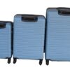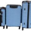 ABS luggage set, hard shell luggage, 3-piece suitcase set, spinner wheels, telescoping handle, lightweight luggage, durable travel luggage, built-in lock suitcase, travel luggage set, light blue luggage, ribbed design luggage, secure zipper closure, interior straps luggage, multi-directional wheels, combination lock suitcase, ABS hard shell luggage set.