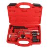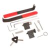 This comprehensive kit is designed for engine timing and belt replacement on VAG 1.2-2.0D Pumpe Duse, as well as 1.2, 1.6, and 2.0D Common Rail Diesels. It is also compatible with these engines when fitted in Ford, Dodge, and Mitsubishi models. The kit includes crankshaft locking tools for both oval and round crank gears, camshaft locking pins, and tensioner adjustment tools. It is suitable for VAG, Dodge, Ford, and Mitsubishi 1.2D and 1.4D engines.