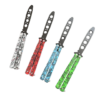 This Skully Trainer Butterfly Knife boasts a sleek Skull and is available with a Handles in Red, Green, Blue or Grey. The Skully Red Popping Eyes with the black blade design makes this butterfly knife, perfect for those practice sessions. Its unsharpened edges keep you out of harm’s way while you master the art of flipping.