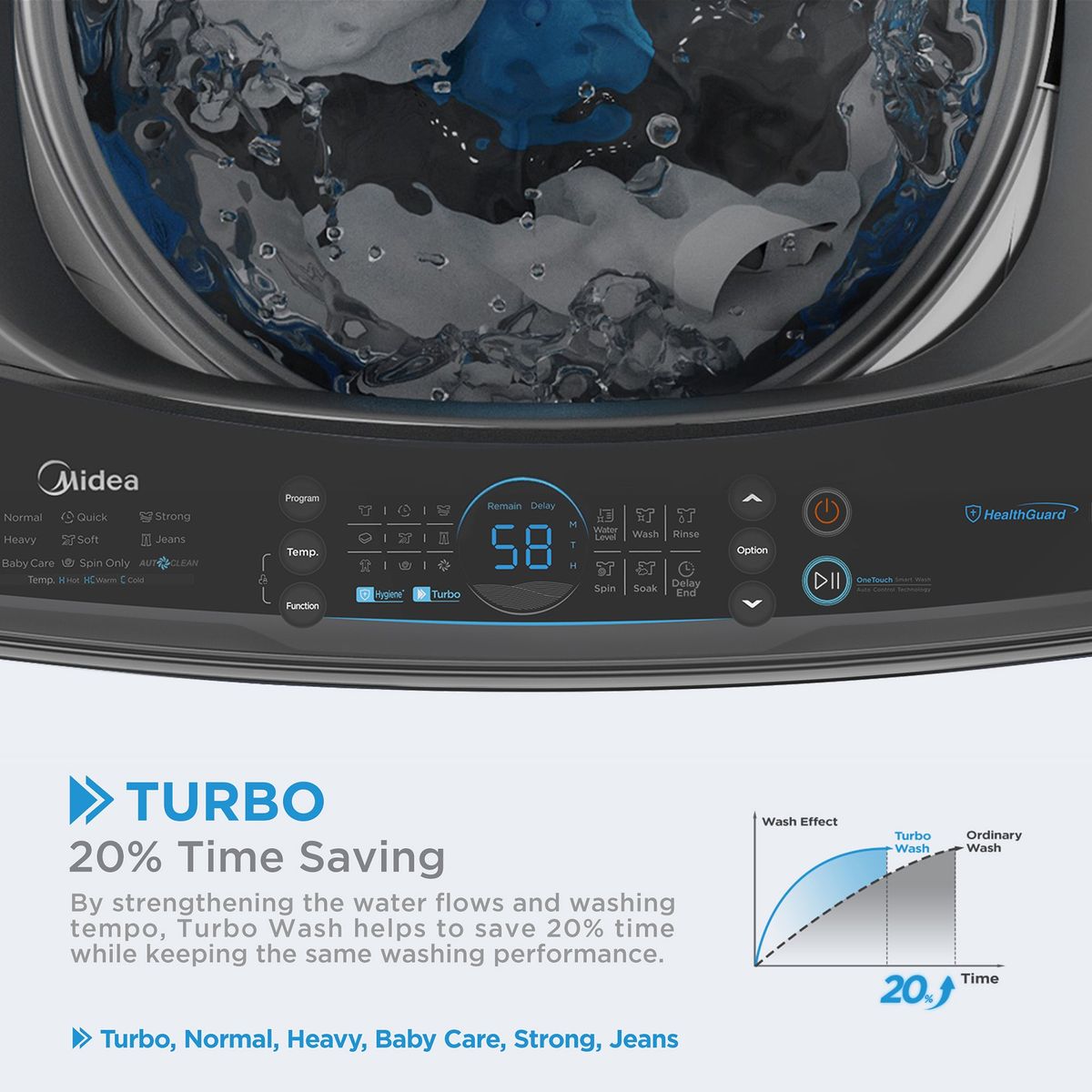 Time Saving Turbo Wash- 20% time saving – strengthened water flow and washing temp