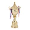 Gold Legacy presentation cup available in three sizes 50, 56 & 63cm. Features a gold bowl with a flame figurine attached to the lid and decorative handles with traditional ribbons, on a gold plastic stem. Mounted on a gold base, ideal for any sporting event or competition.