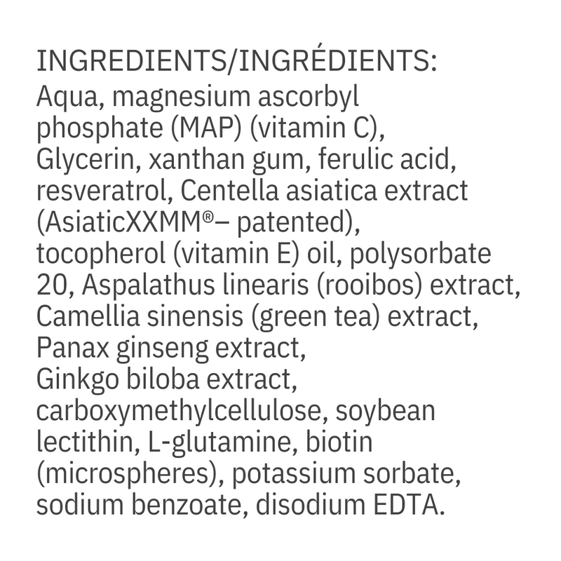 Ferulic acid, resveratrol, magnesium ascorbyl phosphate (MAP) (vitamin C), Centella asiatica extract (AsiaticXXMMâ patented), tocopherol (vitamin E) oil, Aspalathus linearis (rooibos), Camellia sinensis (green tea), Panax ginseng, Ginkgo biloba.