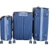 Travel in style and comfort with this navy 3-piece hardshell luggage set, designed for the modern traveler. Made from durable ABS plastic, the suitcases feature a ridged texture that enhances their visual appeal and provides extra durability. The set includes three suitcases in different sizes (small, medium, large) to cater to all your travel needs. Each suitcase is equipped with 360-degree spinner wheels for effortless maneuverability, making it easy to glide through busy airports.