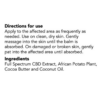 Apply to clean, dry skin. Gently massage into the skin until the balm is absorbed. Use as frequently as needed.
