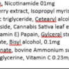 Water, Glycerin, Nicotinamide , Arbutin, Mulberry extract, Isopropyl myristate, Caprylic/capric triglyceride, Cetearyl alcohol, Cetearyl glucoside, Cannabis Sativa leaf extract, tocopherol (vitamin E) Papain, Gylceral stearate, PEG-100 stearate, Bisyl alcohol, , Sodium Hyluronate, acryloyldimethyl bovine Ammonium sulfonate/VP cololymer, Ethylhexyl glycerine, Vitamin C