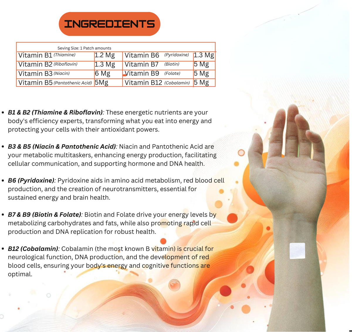 Our patches are made with B vitamins and hypoallergenic materials, ensuring no harmful side effects and providing a natural boost to your energy levels.