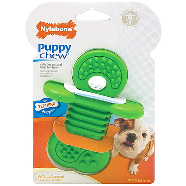 A multi-textured toy providing chewing relief. Nylabone Rubber Teethers are vanilla flavoured, infact, the flavouring is mixed into the nylon, ensuring that every bite will still be a tasty as the first one.