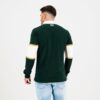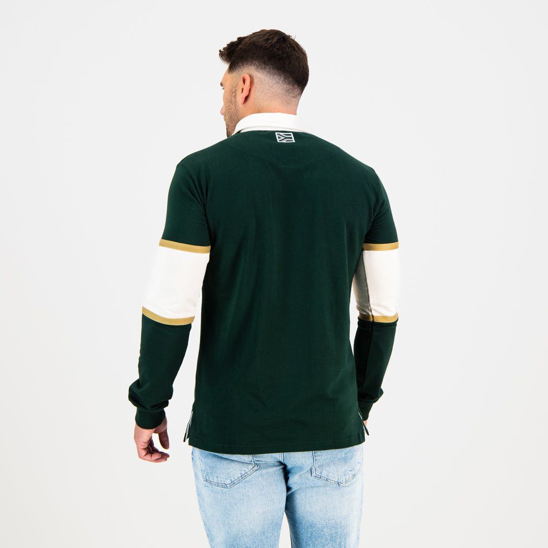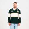 The striking green main color exudes the nation’s vibrancy, while the off-white stripe across the chest and arms adds a touch of elegance. Embellished with a thin golden tape on the top and bottom of the white stripe, this design exudes a sense of prestige and style. The back of the jersey maintains the classic green fabric, complemented by a small white outline of the South African flag just below the collar, symbolising unity and pride.