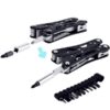 – A combination of spring-loaded pliers, wire cutter/stripper and saw, bottle and can opener, 11 separate screwdriver bits for increased function.