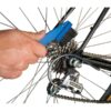 Park Toolâs GSC-1 GearClean Brush has a unique design. A large comfortable handle with a curved, toothed-end reaches dirt deep between the gears, and tough nylon bristles clean the derailleur and chain. Saves wear and tear on your chain and freewheel. Works great on brakes or other places where dirt collects.