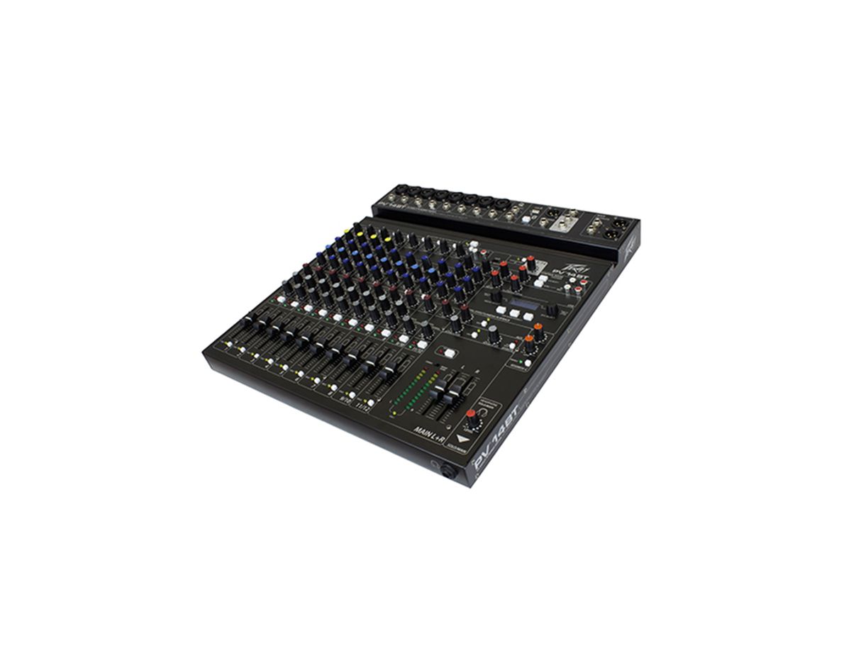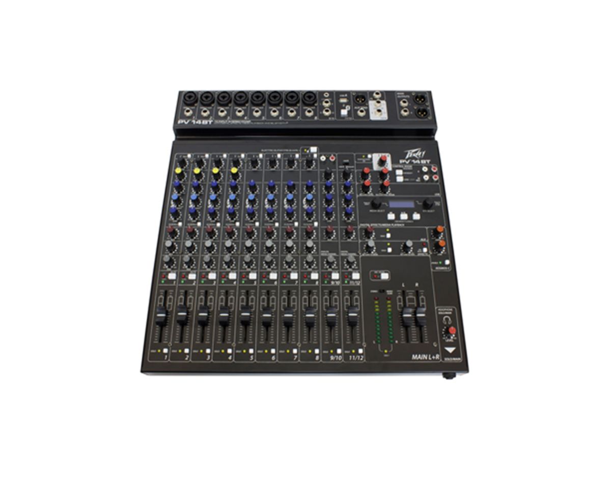 Modern features such as Bluetooth allow seamless connection to almost any “smart” device. 8 direct outs allow easy connection to most DAW interfaces for recording. In addition, the PV 14 BT can stream audio directly to a PC. MP3 playback is also available, just plug a flash drive with MP3 files on it into the USB A port and use the LCD to select and play back music. The PV series Solo feature allows the user to listen to individual channels via headphone or control room outputs, and the EQ bypass allows the user to hear and compare the EQ’d signal to the original signal with the push of a button. 4 channels of compression keep signals with difficult levels under control, and Peavey’s exclusive guitar shape adjusts the EQ and preamp specifically for guitar. Hi pass filters on every channel remove unwanted rumble and noise, and balanced AUX and Master outputs ensure a clean noise-free signal to your powered speakers or power amplifier.