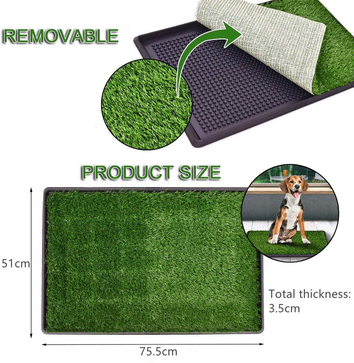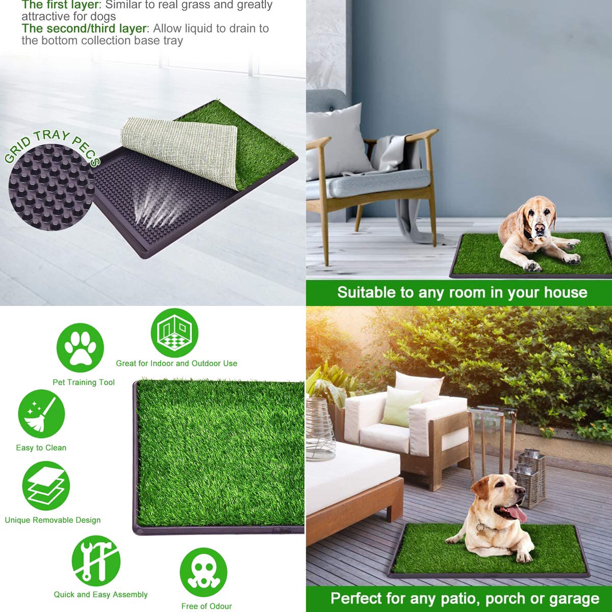 - The artificial grass mat top is similar to real grass and greatly attractive for dogs.
