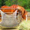 The slow-feed mesh design aids in regulating horse digestion, preventing overeating and promoting a more natural, gradual intake of hay for overall equine wellness
