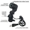 Designed to work with all E27 screw light, accommodate light bulbs or slave flash, built-in umbrella holder and light stand mount, easy mount to a light stand and easily adjustable for different shooting angles.