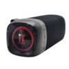 Audio Krush Outdoor Wireless Speaker placed on a white surface likely a display or sales counter The box is predominantly black with red accents and features several icons indicating the speaker’s capabilities such as Bluetooth connectivity design and hands-free calling The background includes various other electronic products and boxes suggesting that the setting is an electronics store or a similar retail environment