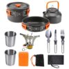The set includes a reliable camping stove that efficiently utilizes fuel for cooking outdoors. It’s compact and easy to assemble, providing consistent heat for various cooking needs, whether boiling water or simmering meals.