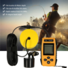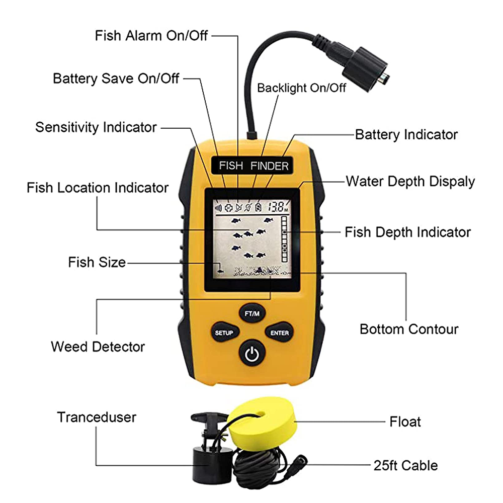 The fish finder portable detector range is in a 45°cone underwater. The detection of depth range is from 3ft(1m) to 328ft (100m) below fishing sonar transducer. The fishing sonar sensor is with 25 ft (9m) cable and removable transducer float. Water depth shows by meters/feet.