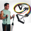 resistance bands, 5 different color/strengths bands, made of professional quality 100% natural rubber latex dipped tubes to ensure maximum life. Each band is 1200mm in length, resistance tension levels from 8lb – 22lb easily creating 30 different combinations, strong & Soft cushioned foam handles with carabineer fastenings for comfort during exercise.