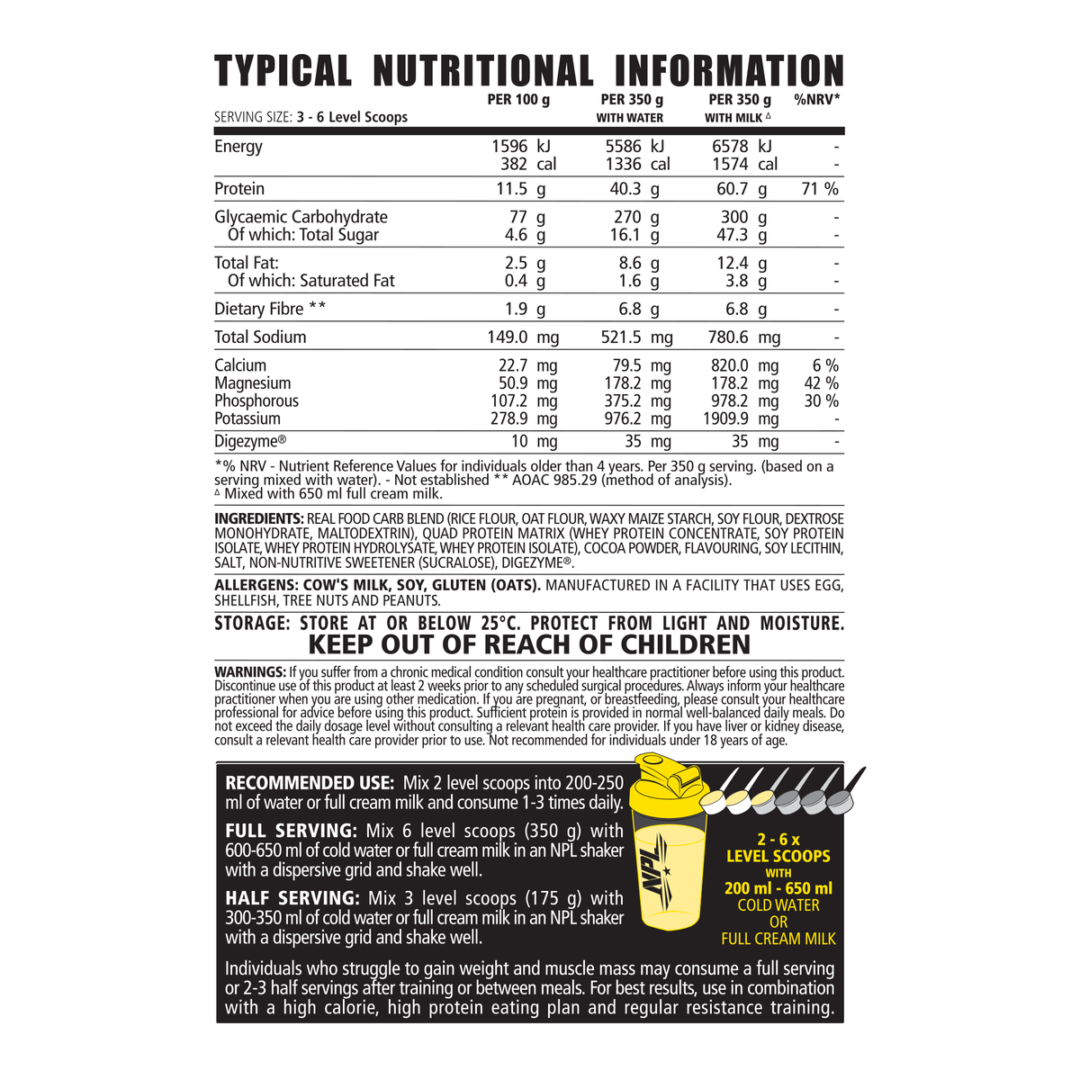 Pro Mass is an all-in-one mass-gainer developed for the hard gainer and contains five real-food carbohydrate sources to maximise glycogen replenishment and mass gain. The carbohydrate sources in Pro Mass have been strategically selected to provide mixed-stage carbohydrate absorption for both fast and slower acting energy. Each serving provides over 1 300 heavy-duty calories to overcome catabolism and increase mass gain as well as 40 g of protein per serving for enhanced muscle repair and growth. Pro Mass contains DigeZyme , a blend of digestive enzymes to enhance protein absorption and prevent digestive issues.