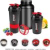 All in one stylish durable & unbreakable gym shaker bottles with extra serving storage two detachable compartments for dry protein powders, fruits, snacks, pre/post-workout supplements storage & add on vitamin pills or capsules tray.