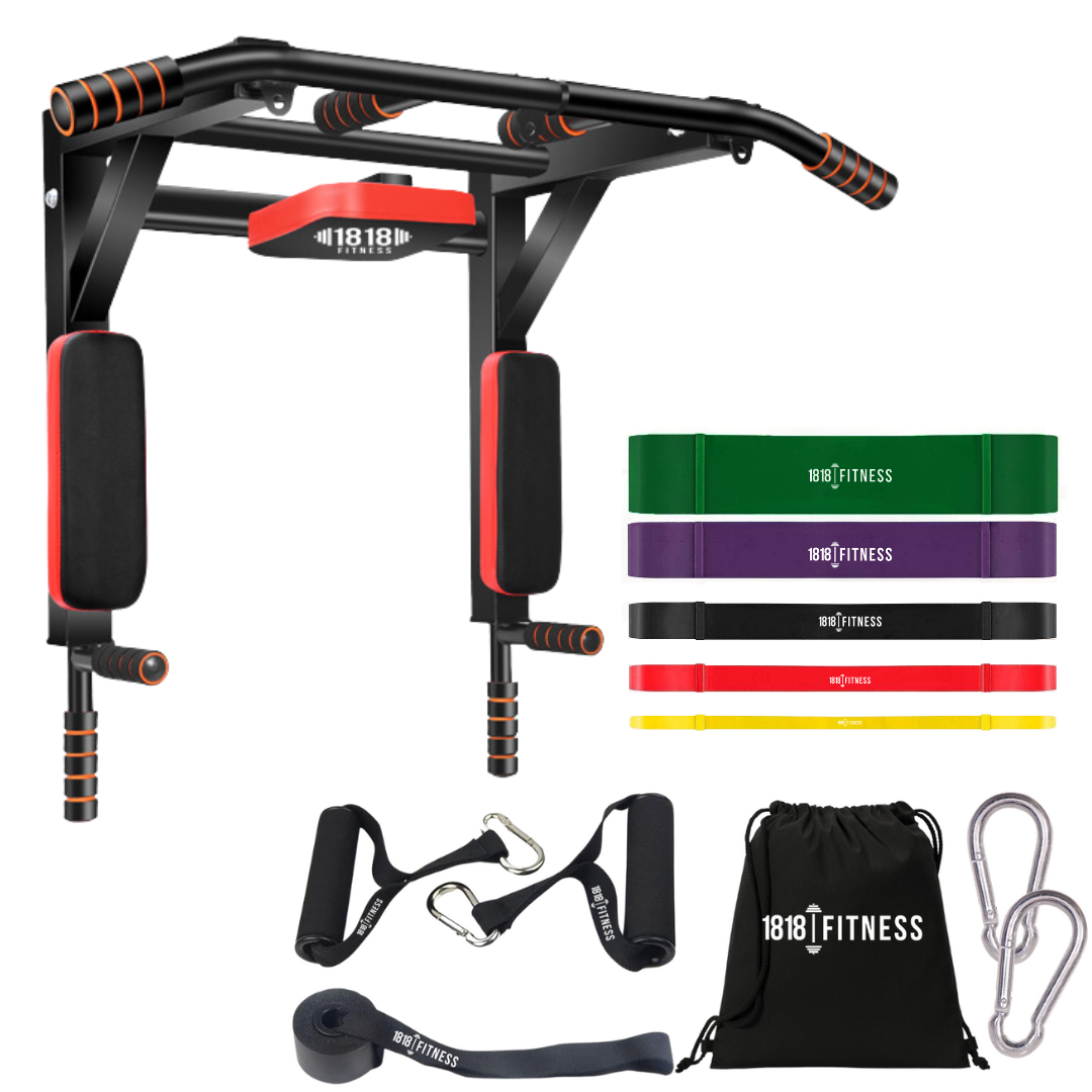 Introducing the 1818 Fitness Two-Way Dip, Ab, and Pull Up Mount and Resistance Bands Combo Set – a heavy-duty and versatile addition to your home gym.