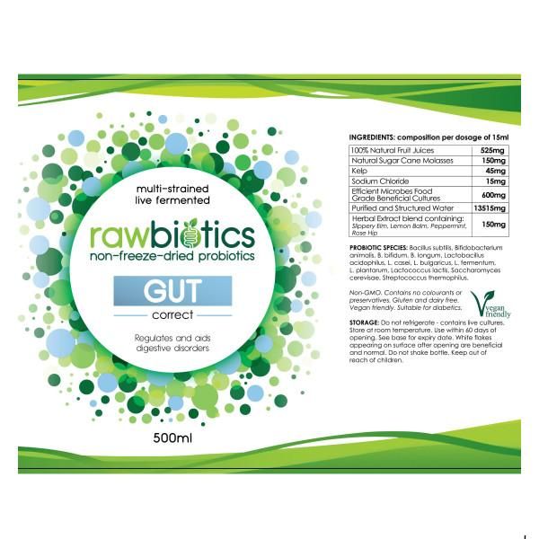Rawbiotics Gut formula is a probiotic that works to correct imbalances that lead to digestive disorders such as IBS, bloating, acid reflux, diarrhea and constipation and restores long-term healthy balance to the gastro-intestinal tract.It contains a selection of herbal extracts that work with the live probiotic to address the cause of digestive issues and restore long-term healthy balance to the gastro-intestinal tract.