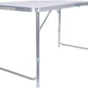 Durable and lightweight. The table features telescoping legs for vertical height adjustment with a handle for easy carrying. Supports up to 44 lbs
