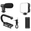 – It has a U-shaped handheld bracket, a mini LED video light, a microphone, a phone holder, and a remote shutter, suitable for smartphone/ camera vlogging, and video recording.