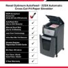 The Rexel Optimum Autofeed Paper shredder for secure disposal of confidential documents, auto feed up to 225 sheets of A4 paper (80gsm) at a time, manual slot for up to 10 sheets, Easy empty 60L pull out bin. Ideal for Office Use. The automatic paper shredder is suitable for up to A4 size paper, shreds credit cards, staples and paper clips and features anti jam technology for preventing paper jams. The 225X paper shredder has a 30 minute continuous run time with fan cooling, touch control panel and infra red bin full sensor. For continuous performance oil regularly with Rexel Oil Sheets. Shredding supports POPIA (Protection of Personal Information Act) compliance, auto feed shredders ensure this task is easy and efficient, saving 98 percent of time versus manual shredding.