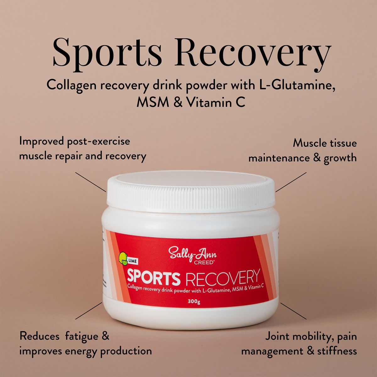 Our Sally-Ann Creed® Sports Recovery powder is specially formulated to improve sport performance by providing the necessary nutrients to enhance recovery. A unique blend with active ingredients that include our famous Type 1 & Type 3 Pure Hydrolysed Collagen, L-Glutamine powder, Vitamin C, MaxiMSM powder and Prebiotic Fibre.