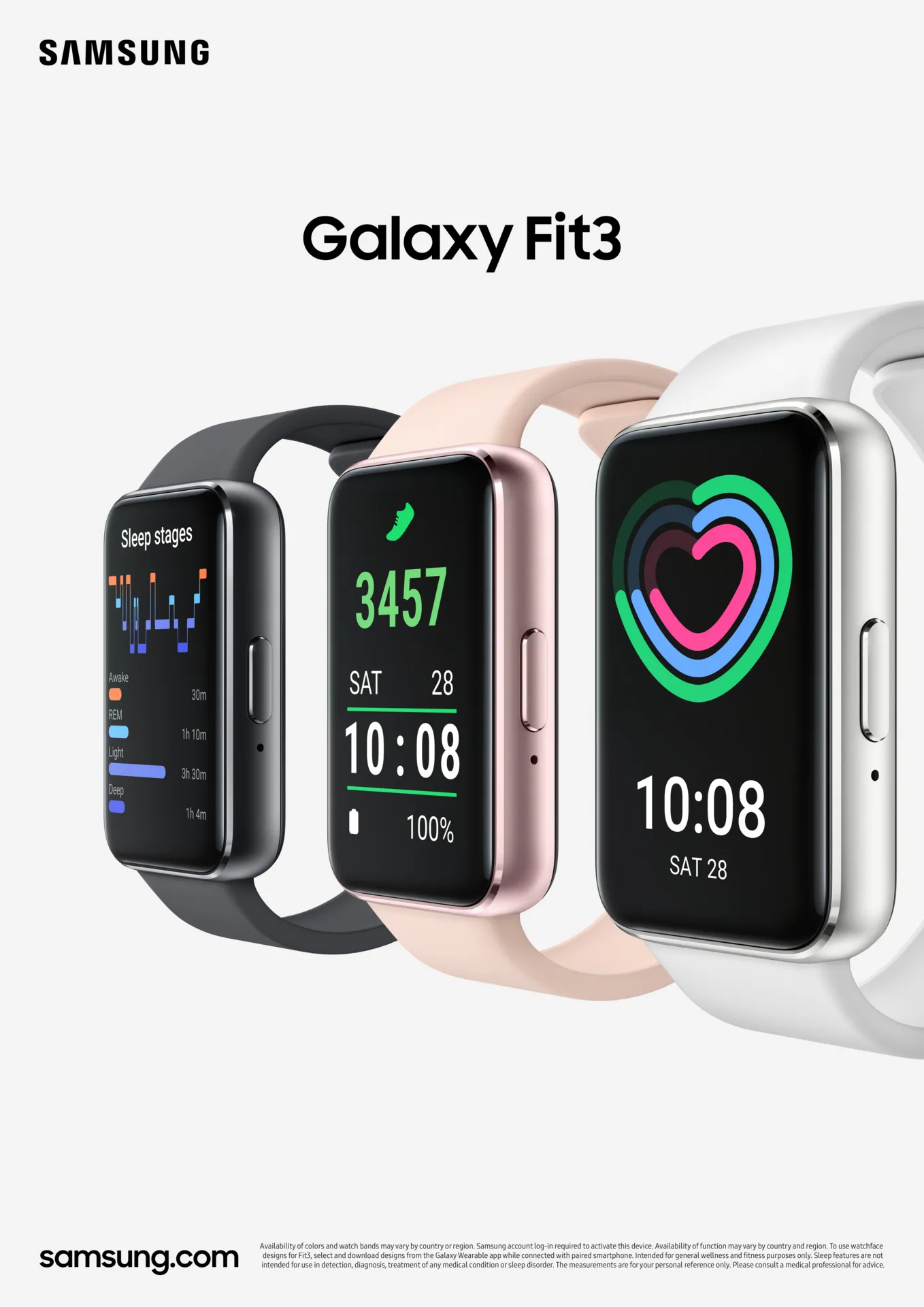 Lasts up to 13 days on a single charge. Sits lightly on your wrist, tracking over 100 workouts and daily activities, including sleep. Lets you play music, check calls and send texts right from your wrist â stay empowered, connected and effortlessly on track with Galaxy Fit3.