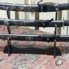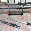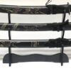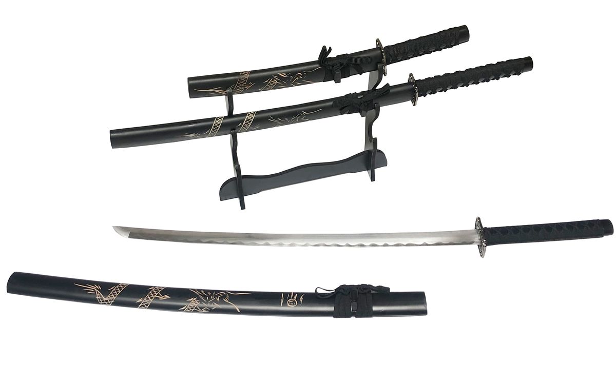 This traditional Japanese 4 piece sword set includes the 98cm long sword Katana, 73cm Wakizashi, 50cm Tanto and a wooden display stand.