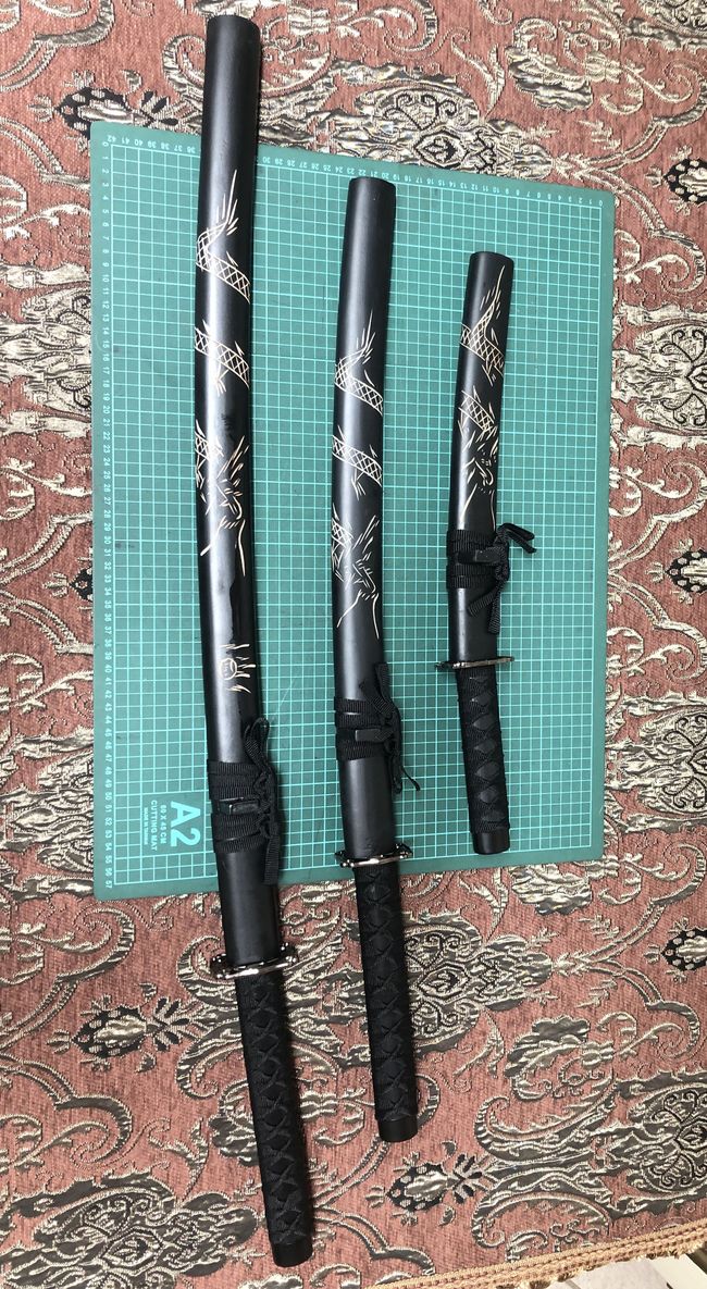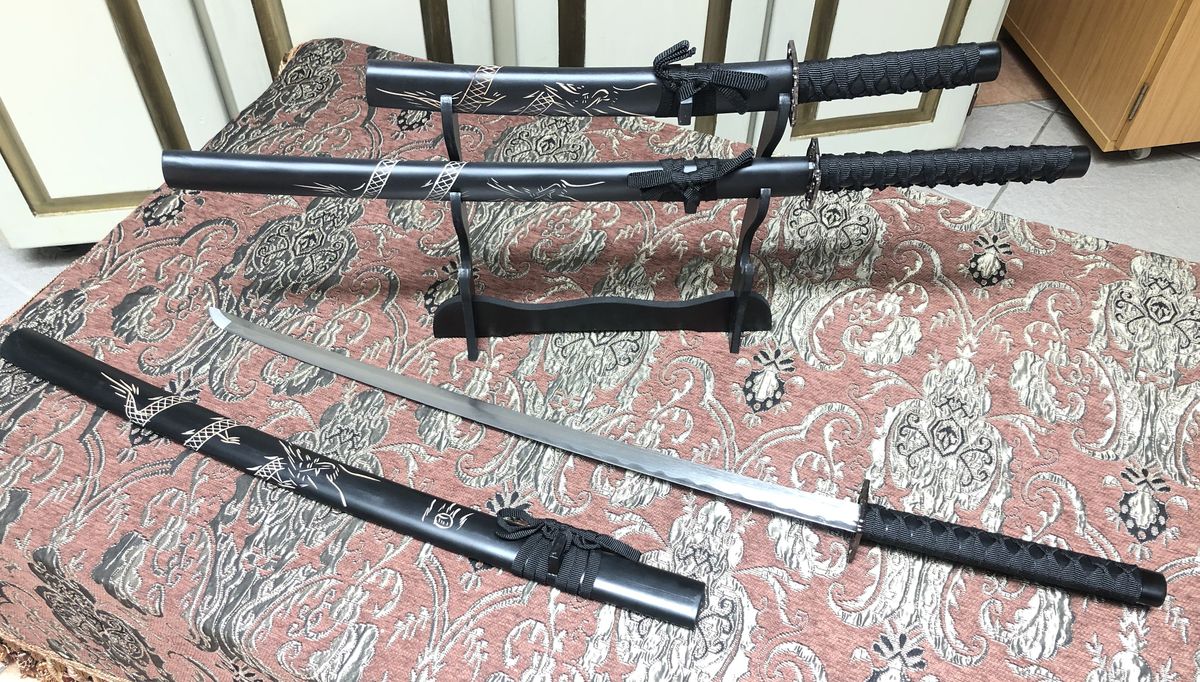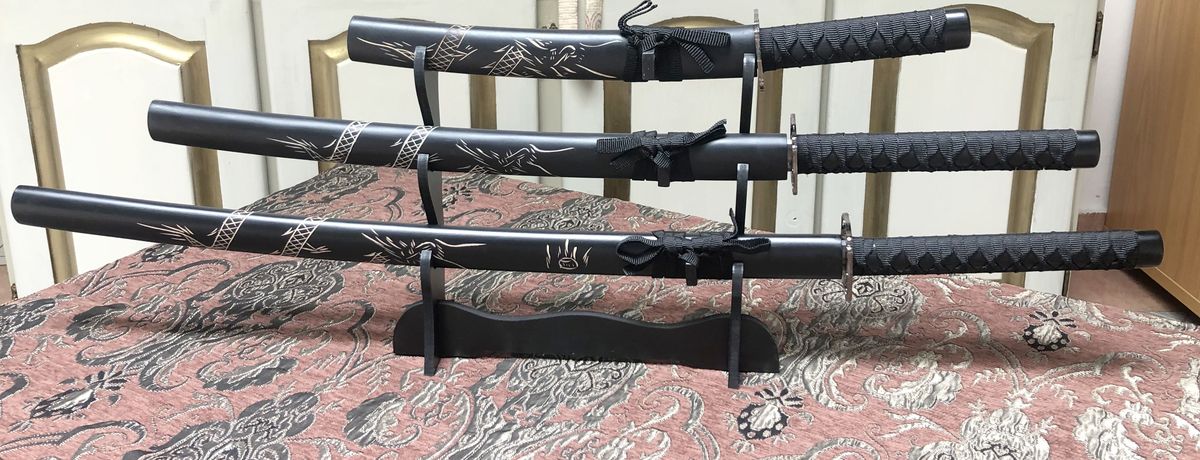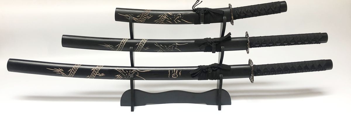 They all have cast tsuba handguards in the shape of two Japanese dragons, and the tsuka handles are finished in a traditional Japanese to wrap.