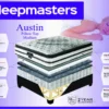 Sleepmasters Austin has Contra Rotating Pocket Coil. Edge supports and corner supports to eliminate that Roll-Off feeling. Multi-layer Pure Foam/ High resilient foams and pads enhances comfort. Weight capacity of 140kg pp. Limits partner movement. Kiln dried base with extra support.