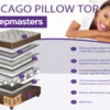 The Sleepmasters Chicago Bed epitomizes luxury and comfort, meticulously designed for a rejuvenating and indulgent sleep experience. Its luxurious pillow top provides a lavish surface with an extra layer of softness, while the luxury stretch fabrics exude elegance and offer a smooth, inviting feel for enhanced comfort throughout the night. Featuring a classic Bonnel Spring System, this bed ensures optimal support and durability, balancing comfort and firmness. The ‘Never Turn’ design simplifies maintenance by eliminating the need to flip the mattress regularly, maintaining its plush feel effortlessly. A firm top base adds another level of support, ensuring proper spinal alignment for a restful sleep. More than just a bed, the Sleepmasters Chicago Bed offers a luxurious and supportive sanctuary that promotes relaxation and rejuvenation every night. Crafted to meet your comfort needs and elevate the aesthetics of your bedroom, it promises a combination of luxury, support, and enduring quality for your sleep sanctuary.