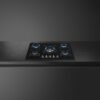 Black glass set on stainless steel with straight edge Classic Controls 4 gas burners (Incl. 1 Rapid 3.6kW flame burner) Heavy-duty cast-iron pan stands GasSafety cut-out device Fitted with LPG Adaptable to Natural Gas. Ultra-low profile or Fully Flushed