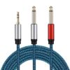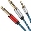 A stereo AUX audio cable with a 3.5 mm to 2×6.35 mm configuration is a cable used to connect audio devices with different jack sizes. One end of the cable has a 3.5 mm stereo mini-jack connector, which is commonly found on smartphones, tablets, and laptops. The other end of the cable splits into two connectors, both of which are 6.35 mm mono-jack connectors. These larger connectors are often used in professional audio equipment such as amplifiers and musical instruments. The cable allows you to transmit stereo audio signals from devices with a 3.5 mm jack to devices with 6.35 mm jacks, providing flexibility in audio connectivity across various devices and setups.