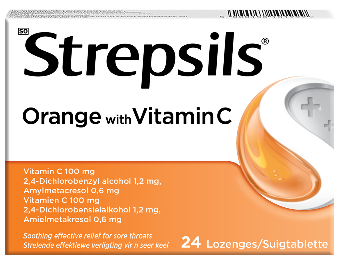 Strepsils Orange with Vitamin C. Reg No. S/16.4/144. Each Lozenge contains Vitamin C 100,0 mg, 2,4-Dichlorobenzyl Alcohol 1,2 mg, and Amymetacresol 0,6 mg. Reckitt Benckiser Pharmaceuticals (Pty) Ltd., 8 Jet Park Road, Elandsfontein, 1601. For full prescribing information refer to the package leaflet approved by the Medicines Regulatory Authority. Customer Care Line: 0861 11 11 00.
