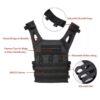Adjustable shoulder strap with detachable shoulder pads. webbing over the entire vest for modular attachments. Internal sleeves for plate front and back.
