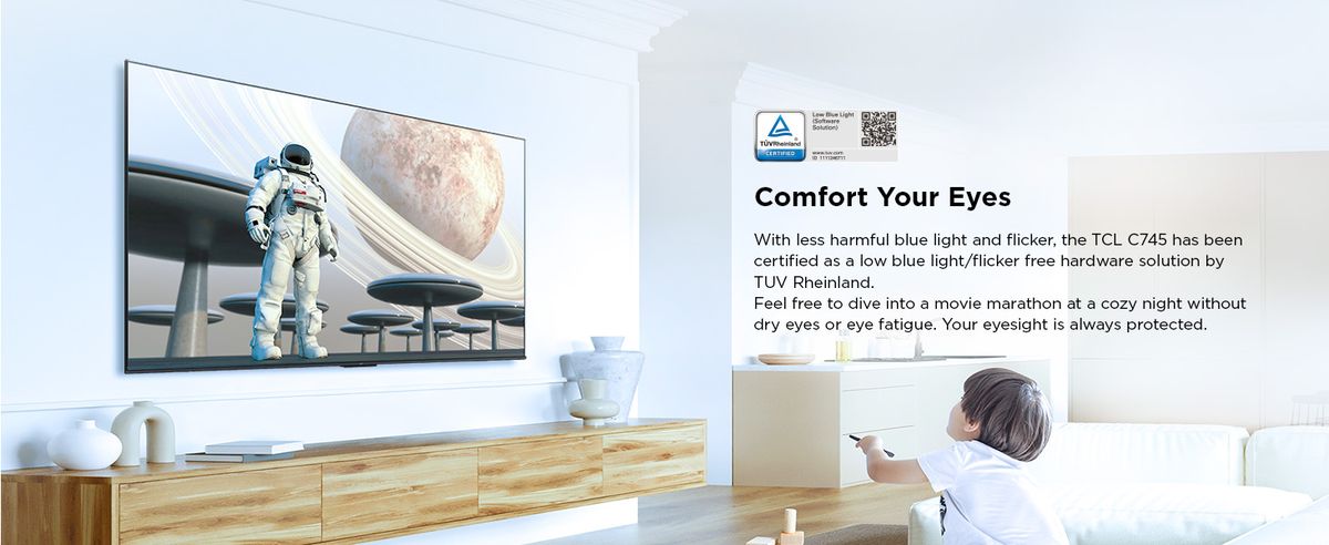 With low blue light & flicker-free, the TCL C745 has been certified as a distinguished eye protection solution by T V Rheinland. Feel free to dive into a movie marathon on a cozy night without dry eyes or eye fatigue. Your eyesight is always protected.