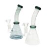 - A beautiful handmade 17/18cm glass bong with a painted detail, it has a curved shaped neck with a solid rimmed wide mouthpiece.