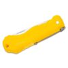 This lightweight folding knife features an interesting locking mechanism, which consists of a lever arm attaching to a notch on the spine of the blade, which securely locks the blade in place until lifted. The blade’s spine features light serrations which easily combat rope and other cords. The bright yellow handle is easily seen in most conditions, further reducing risk of loss in a watery environment. Lanyard hole on handle.
